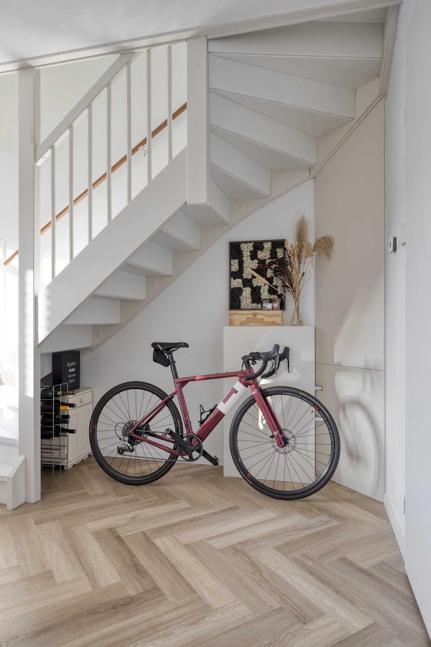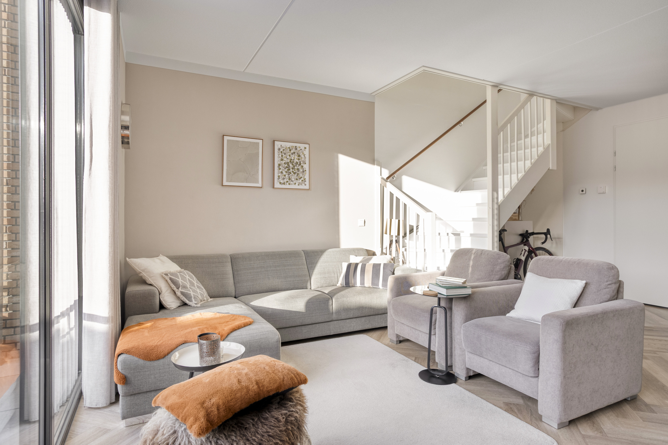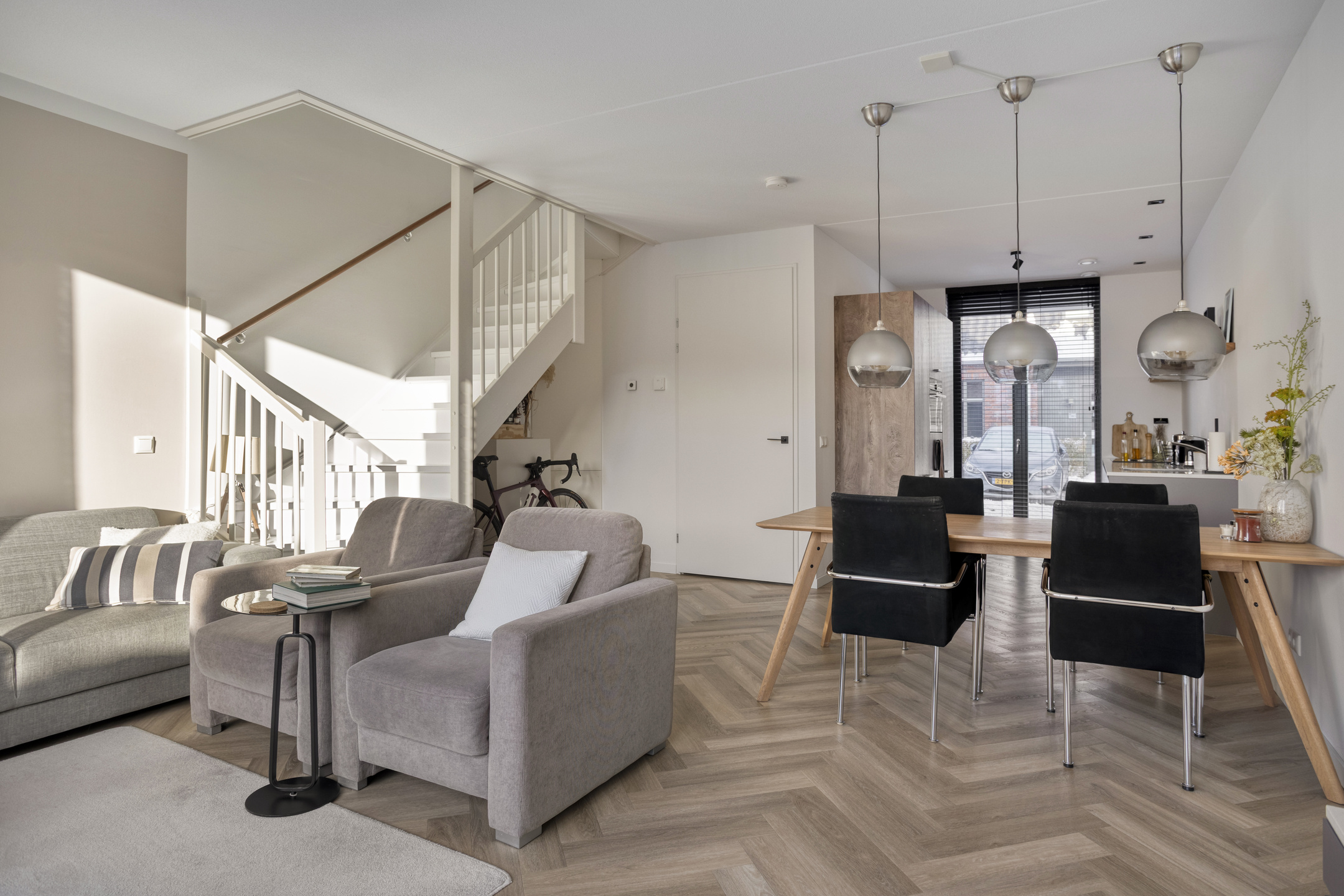 Dankzij de grote raampartij aan de achterzijde geniet je in de woonkamer van een prachtige lichtinval en een fraai uitzicht over de achtertuin. De open trap in het midden van de woonkamer geeft de ruimte een speels en open karakter.