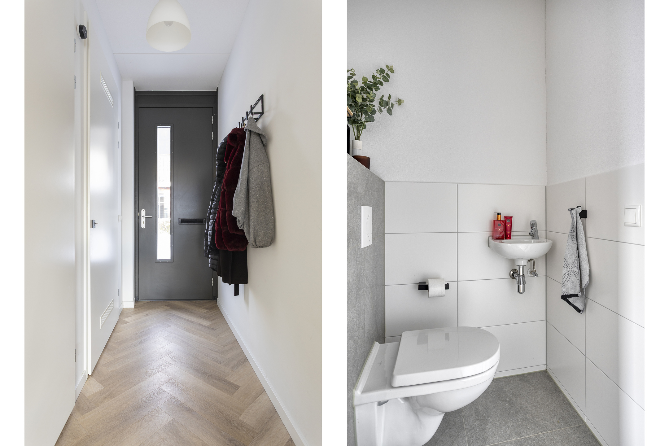 Bij binnenkomst via de overdekte entree betreed je de ruime hal. Hier bevinden zich de meterkast met technische ruimte en het moderne toilet. Het toilet is gedeeltelijk betegeld in een lichte, neutrale kleurstelling en voorzien van een ingebouwd closet en een stijlvol fonteintje.