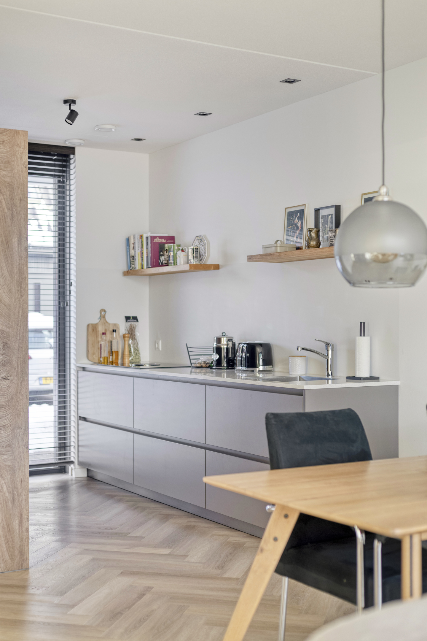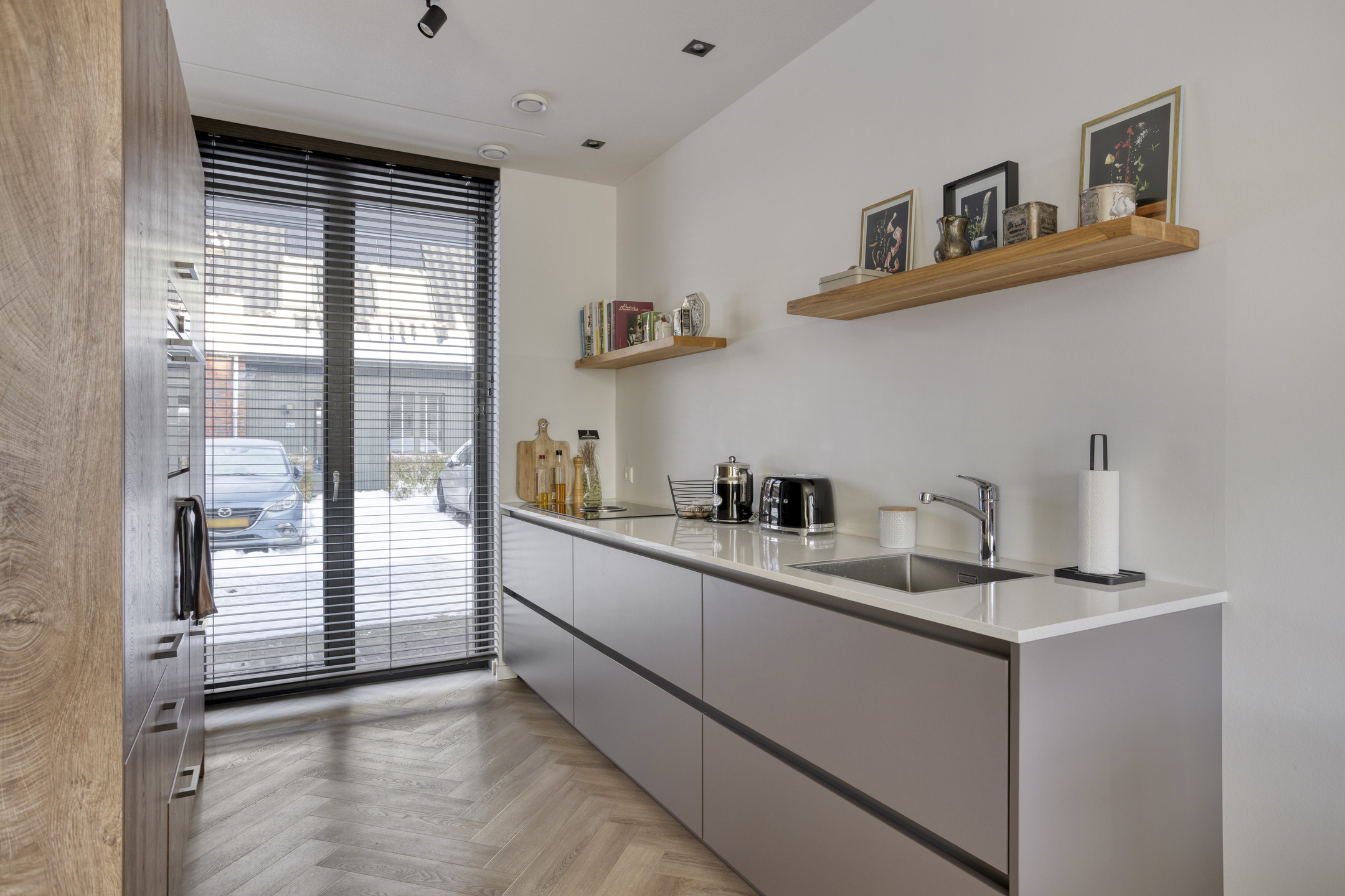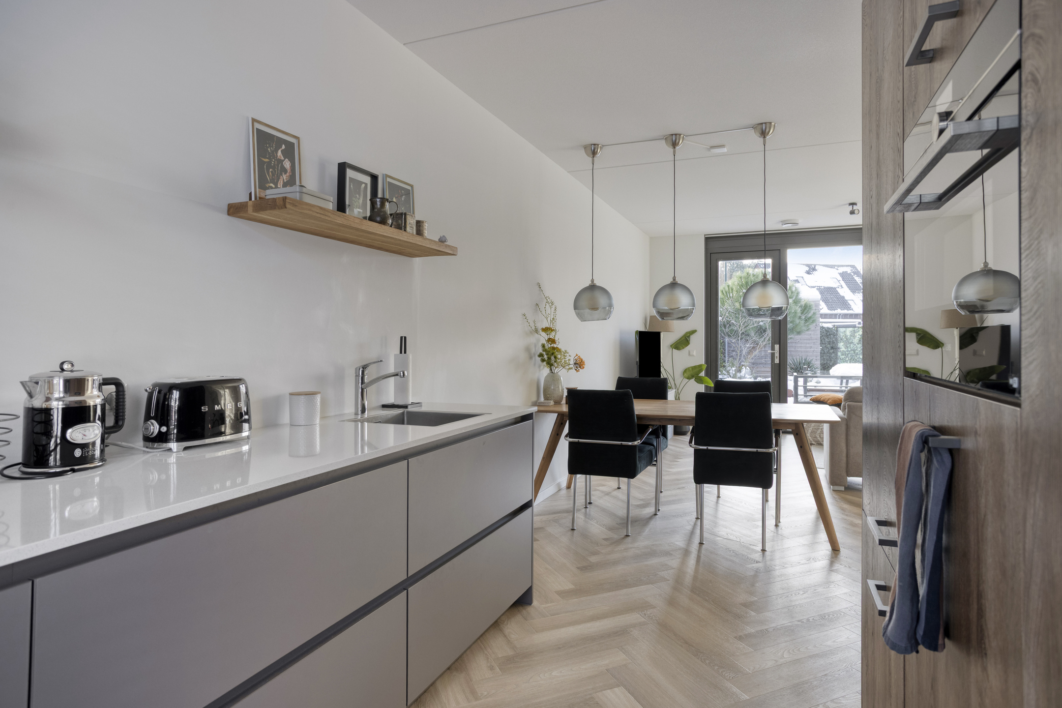 Aan de voorzijde van de woning bevindt zich de luxe, op maat gemaakte keuken van Van Diessen, uitgevoerd in een stijlvolle dubbele wandopstelling. Het composieten werkblad en de hoogwaardige inbouwapparatuur onderstrepen het luxe karakter. De keuken is uitgerust met onder andere een Bora inductiekookplaat met geïntegreerde afzuiging, een vaatwasser op hoogte, een Siemens combi-oven en een koelkast met vriesvak.