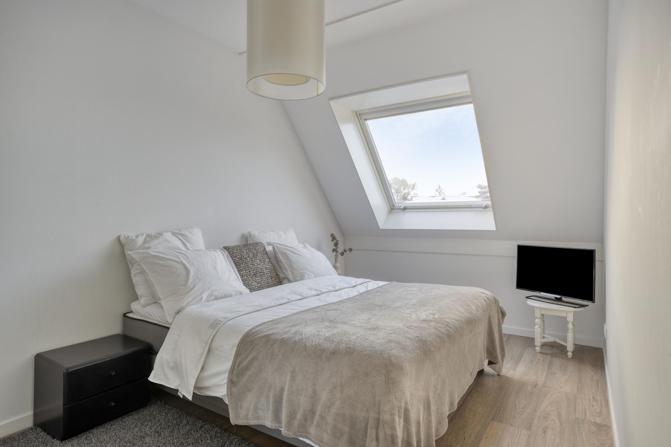 De hoofdslaapkamer is gelegen aan de achterzijde en voorzien van een groot Velux dakraam met zonwering, wat zorgt voor veel daglicht. De tweede slaapkamer bevindt zich aan de voorzijde en beschikt eveneens over een groot Velux dakraam met zonwering.