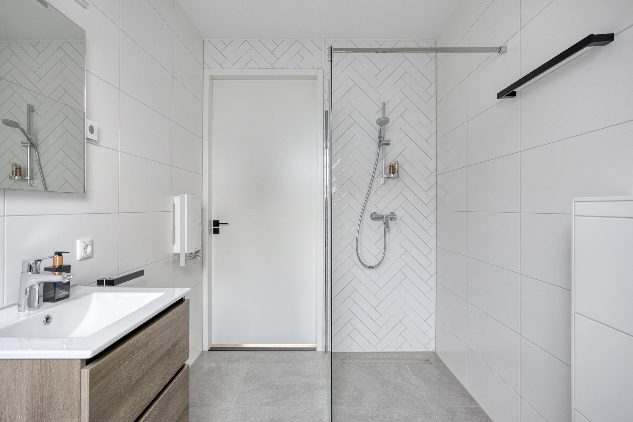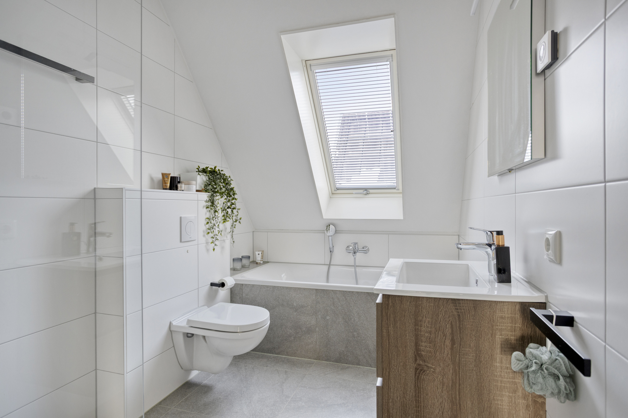 De royale badkamer is luxe ingericht en van alle gemakken voorzien. Je vindt hier een riante inloopdouche met glazen wand, een toilet, een comfortabel ligbad en een wastafel met spiegel. De badkamer beschikt over vloerverwarming en een extra elektrische bijverwarming, wat zorgt voor optimaal comfort in alle seizoenen.