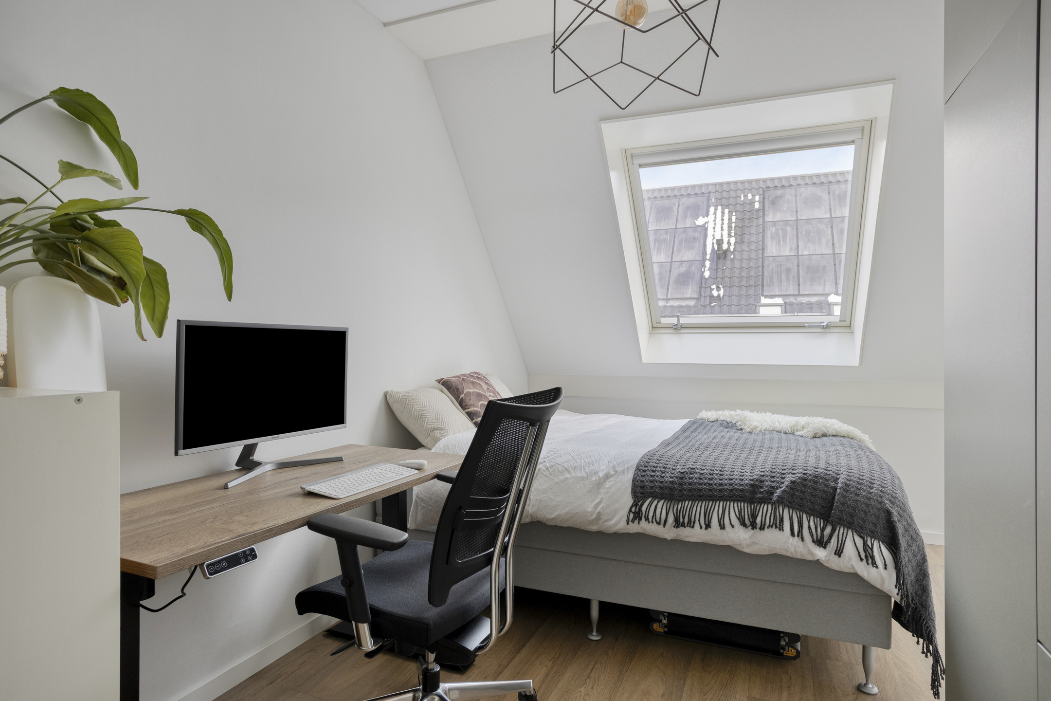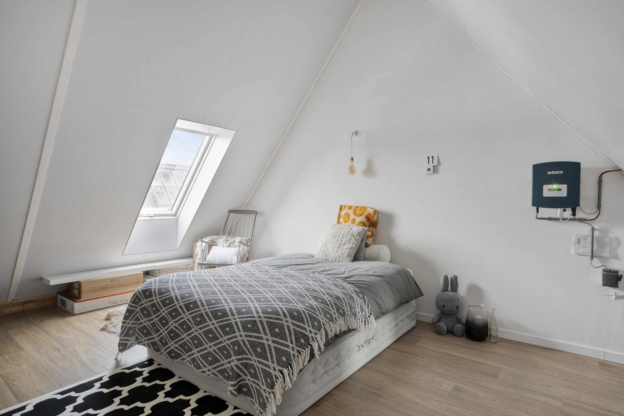 Via een vaste trap bereik je de tweede verdieping. Deze zolderverdieping wordt momenteel gebruikt als logeerkamer, maar is ook uitstekend geschikt als extra slaapkamer, werkruimte of hobbykamer. Dankzij het Velux dakraam is er prettig daglicht aanwezig. Ook deze verdieping is voorzien van vloerverwarming en vloerkoeling, wat het comfort compleet maakt.