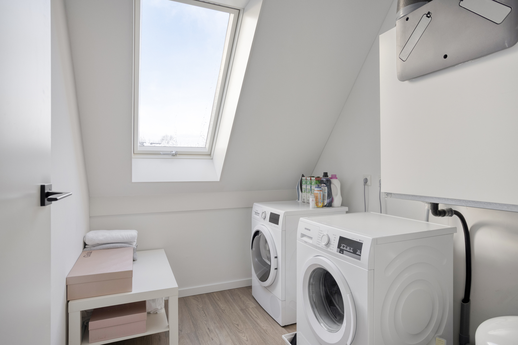 Aan de achterzijde van de verdieping bevindt zich een praktische aparte wasruimte met aansluitingen voor wasmachine en droger. Ook zijn hier de mechanische ventilatie-unit en de verdeler van de vloerverwarming geplaatst.