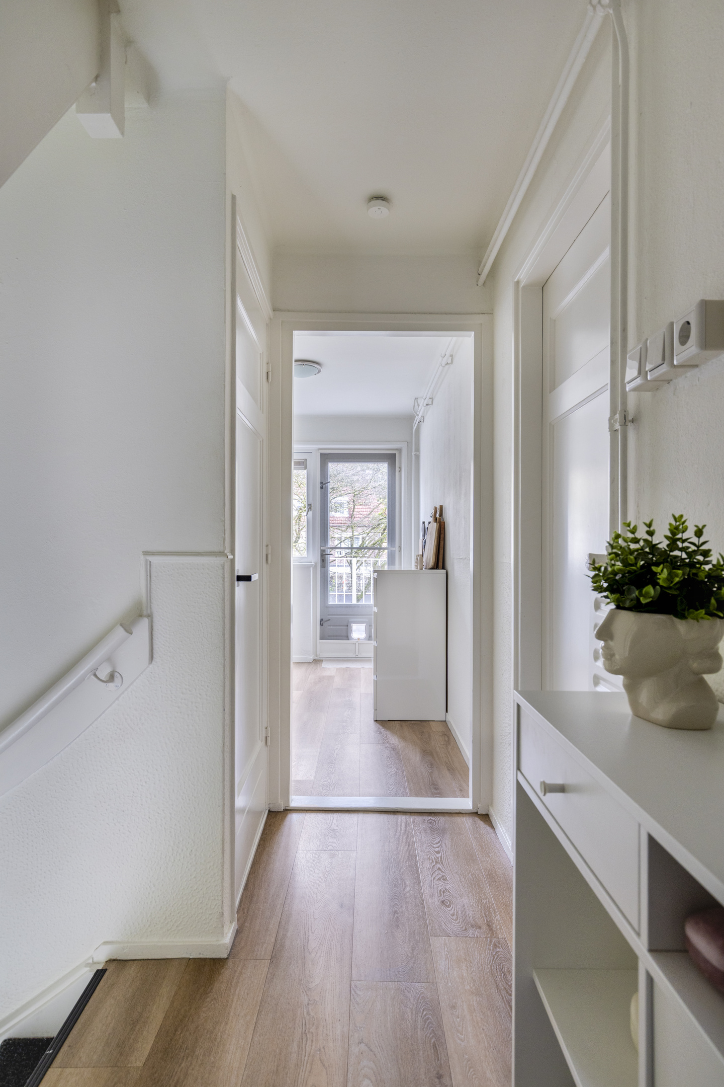 Via de trap kom je op de overloop van de eerste verdieping. Vanaf hier heb je toegang tot de woonkamer, keuken en badkamer.