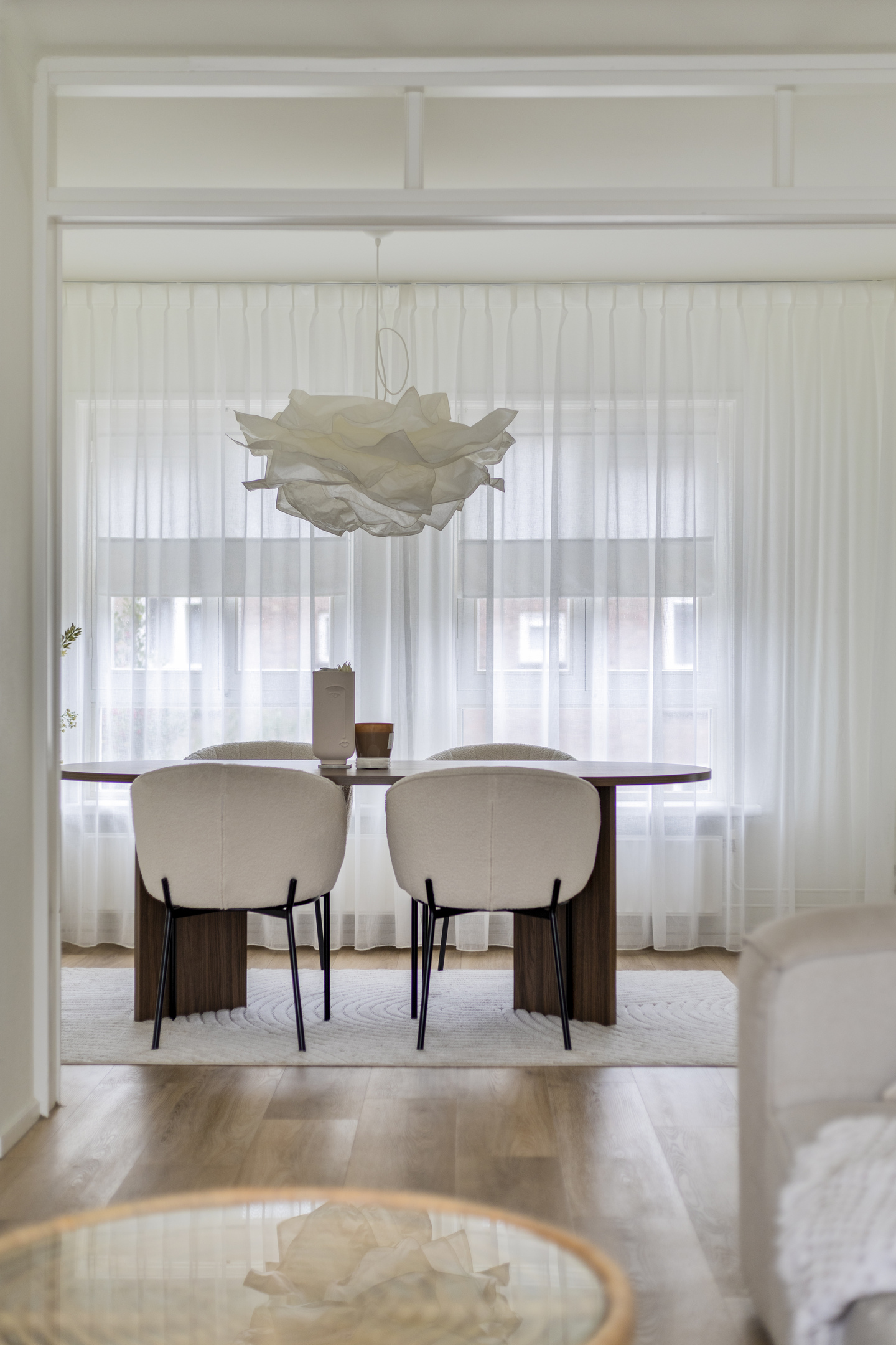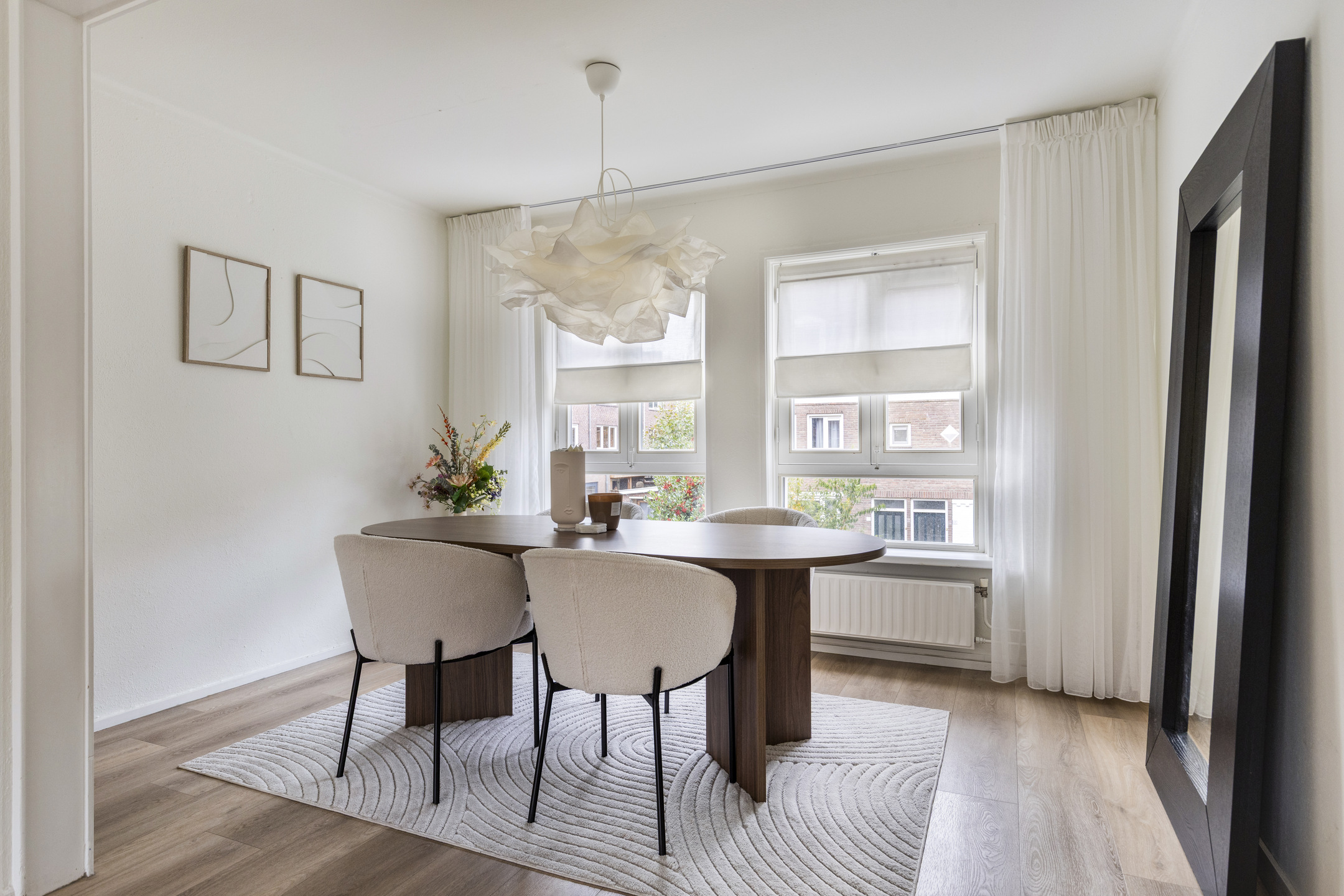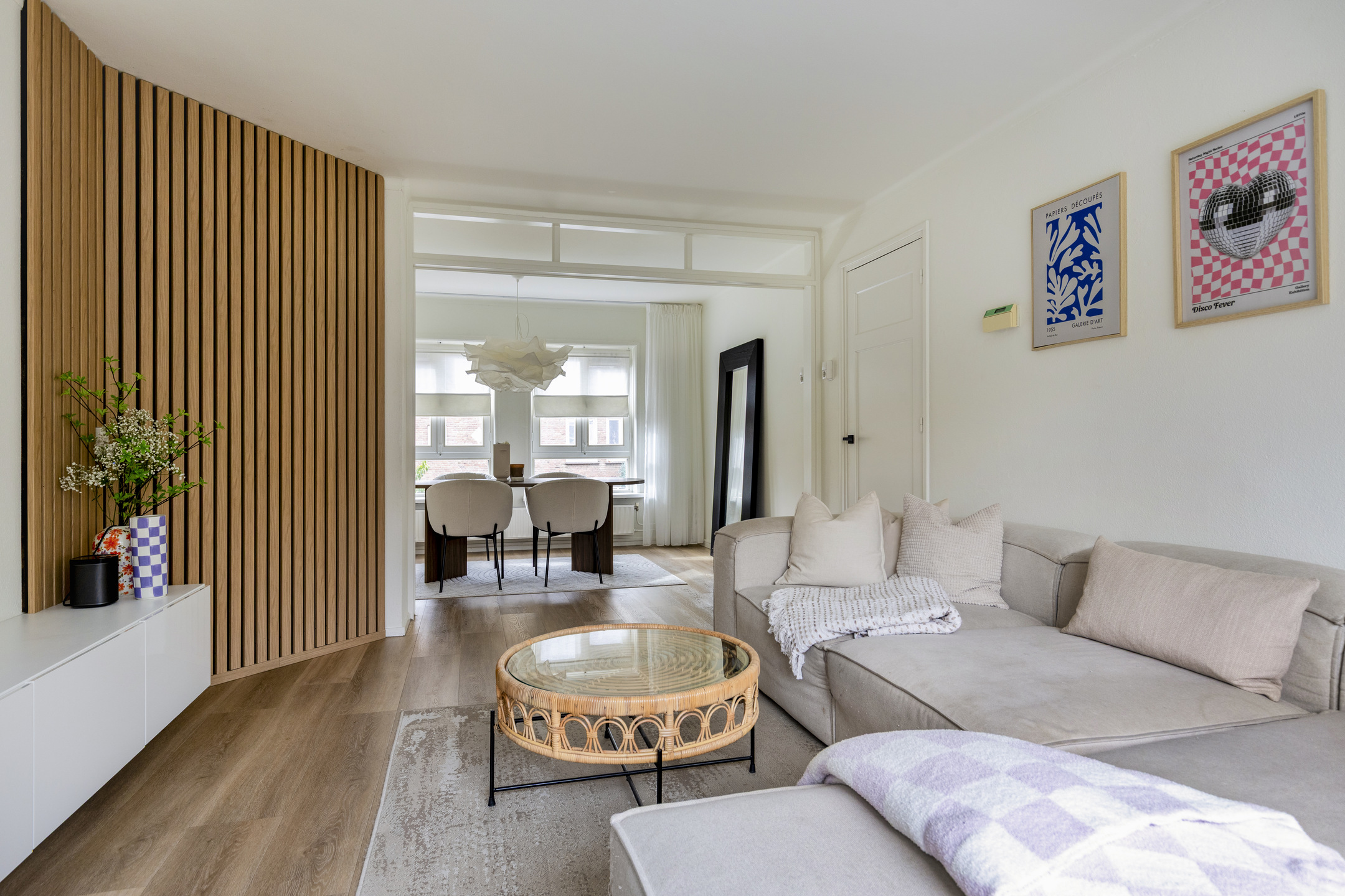 Lichte woonkamer met PVC vloer en grote ramen