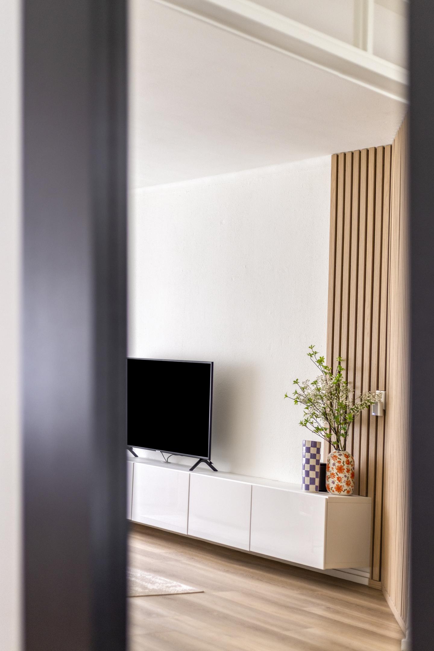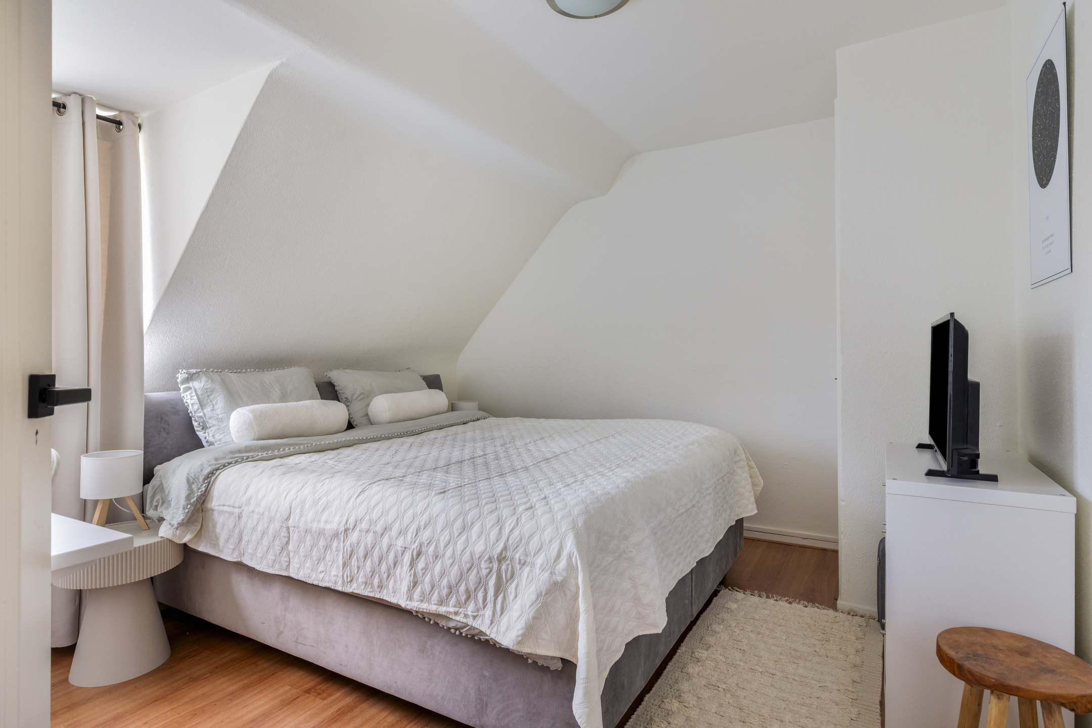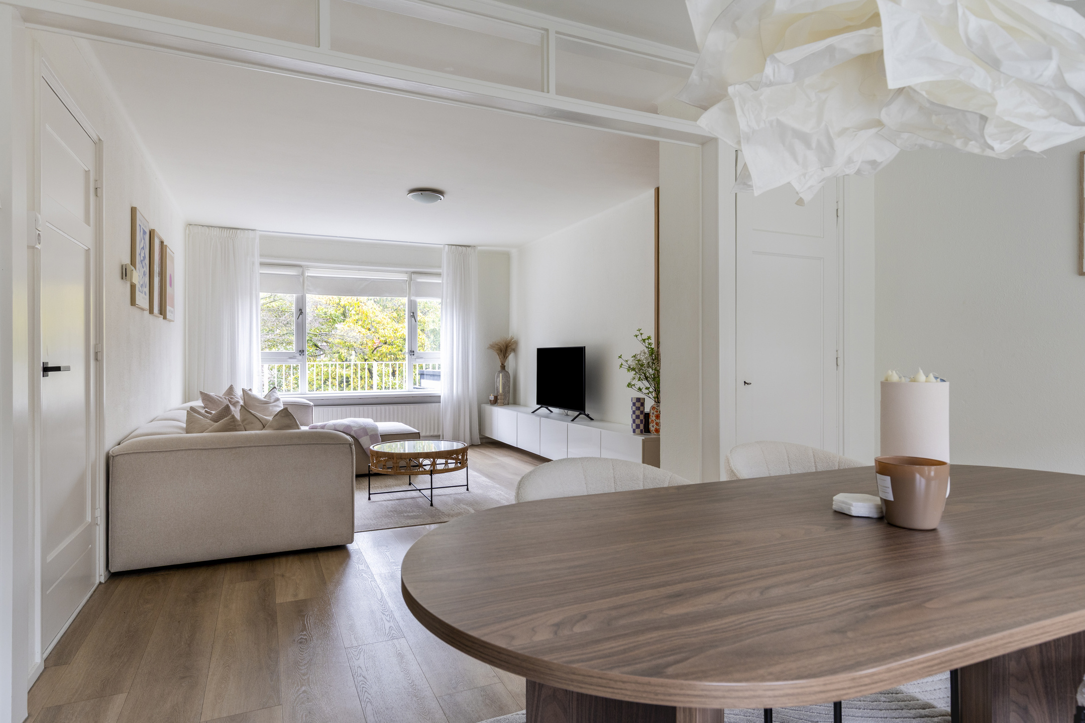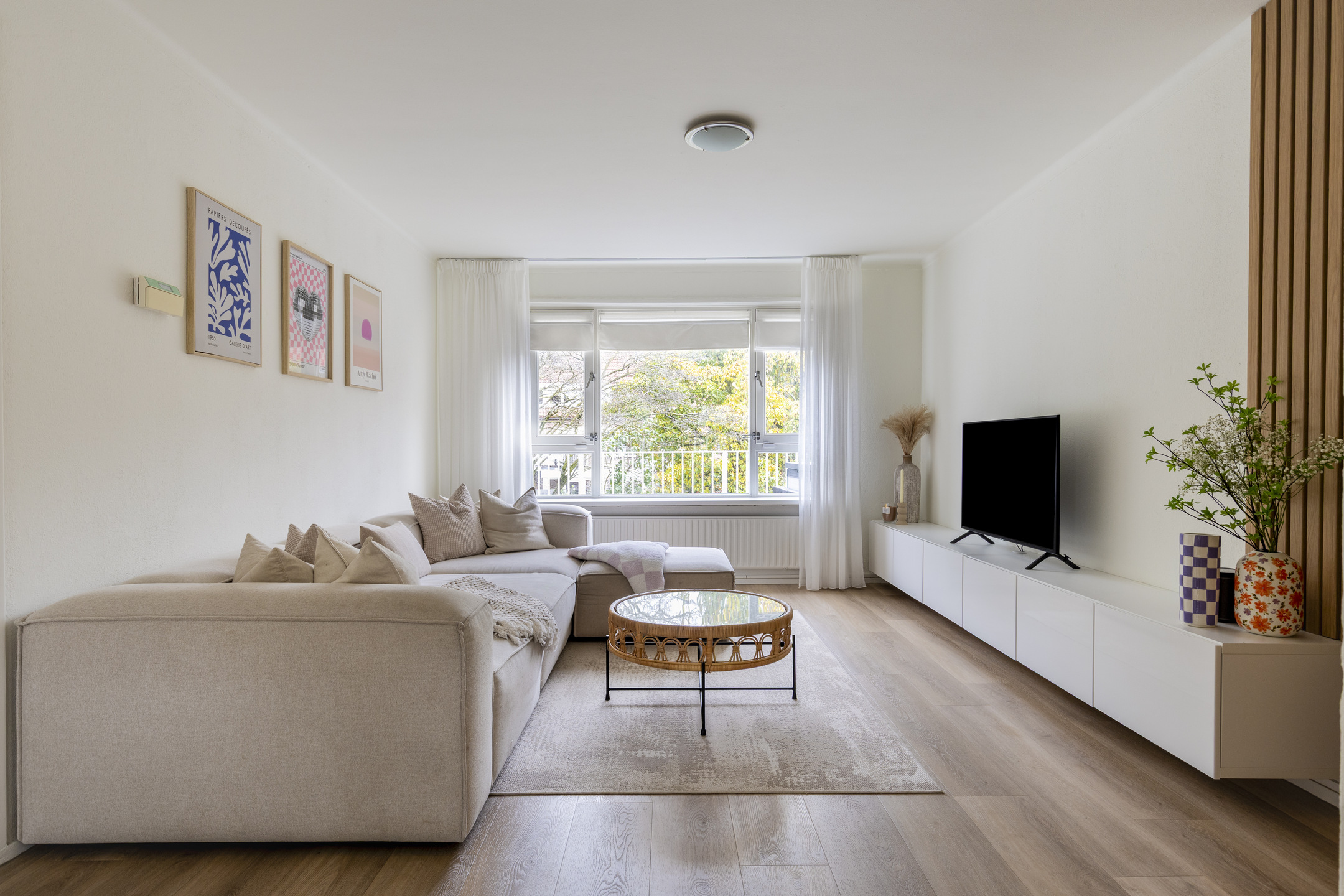 De muren zijn gestuct en voorzien van sierpanelen. Grote ramen aan de voor- en achterzijde laten veel daglicht binnen. Aan de achterkant kijk je uit op het groen en het balkon, wat de kamer een ruimtelijk gevoel geeft.