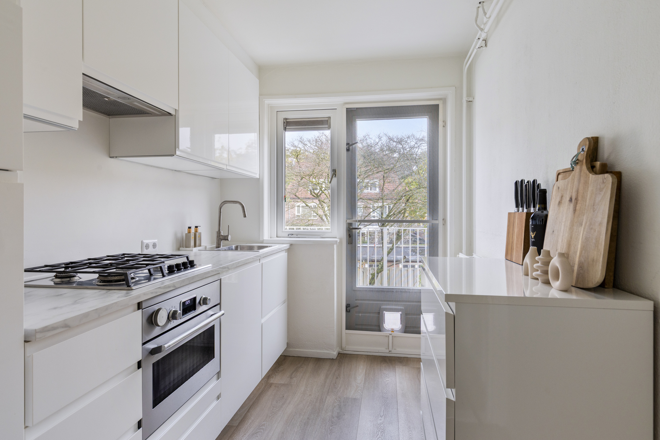 Vanuit de keuken loop je direct het balkon op. De deur kan open voor frisse lucht of om even te genieten van het buitengevoel tijdens het koken.